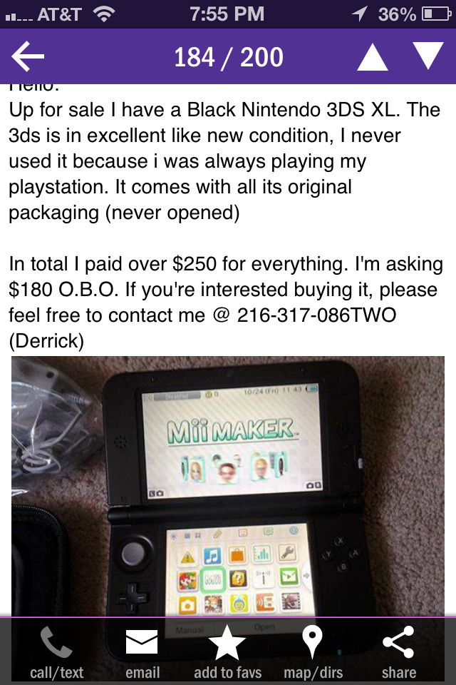 http://newyork.craigslist.org/fct/vgm/4782176224.htmlQuoteHello,I am looking to sell my BRAND NEW & UNOPENED Playstation 4 console. I am looking to sell it for $360, which is a good amount less than the usual $400 (plus tax) that every other retailer sells it for. The actual console is brand new & opened, but I will entertain all serious offers.Definitely feel free to reach out with any questions or offers via e-mail or text since I'm at work during the day.Thank you very much! Can't tell if stolen or Black Friday Deal.