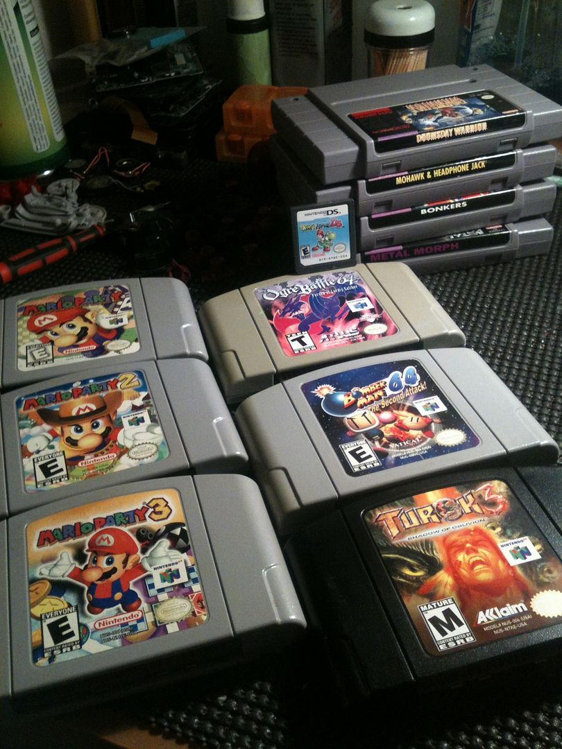 These are my April and May pick ups combined. Not shown in the picture is the original xbox console I picked up. I also got some of the supplies I'll need to sodder new save batteries in my games and a bit tool to open up NES and SNES cartridges. The power tool in the center of the couch is used to modify UGCs for NES. It's much quicker than using end nippers.