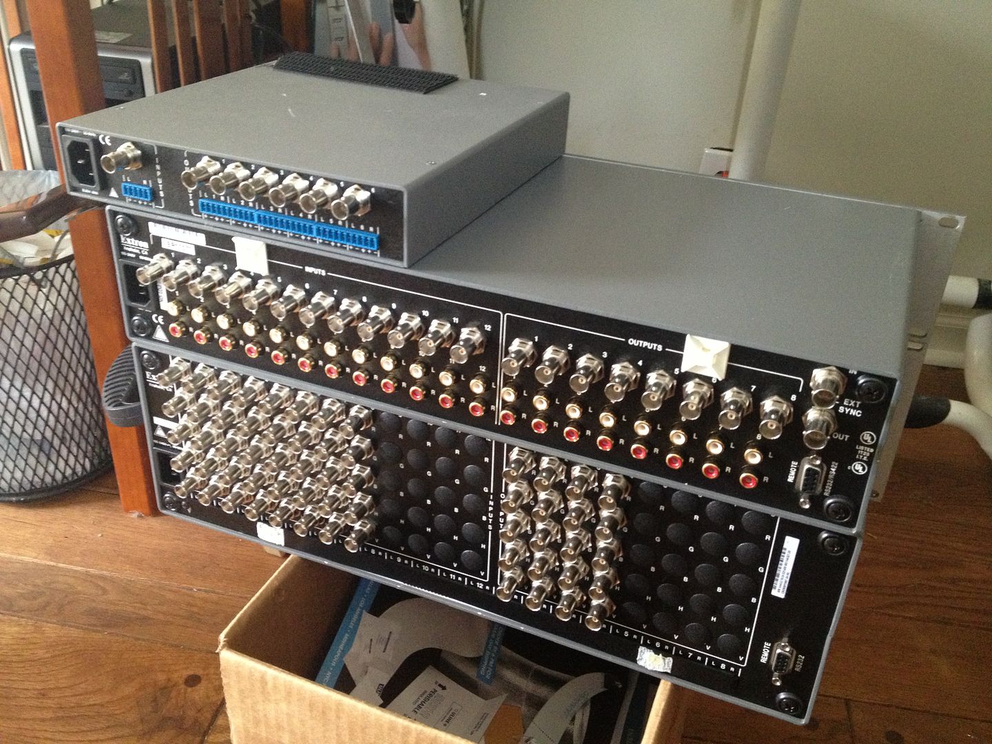Picked up the small one by accident. Misread ending times :-\ But, they're both from the sale seller, and the little one was only 15 bucks :) Plus, he threw in that amp for free because it took him a little while to get the stuff shipped out.  That large unit has 8 inputs. Plan on getting S-vid Y adapters for the SNES, Genesis, Dreamcast, and Saturn, and then I'll hook up the PS3, 360, Xbox, and WiiU via component.  I can only do composite through the little one, but it has 12 inputs. I wish they were switched around :( I only have like 2 systems to hook up via composite. But at least I can try out that composite amp and see what it does for the picture ;D
