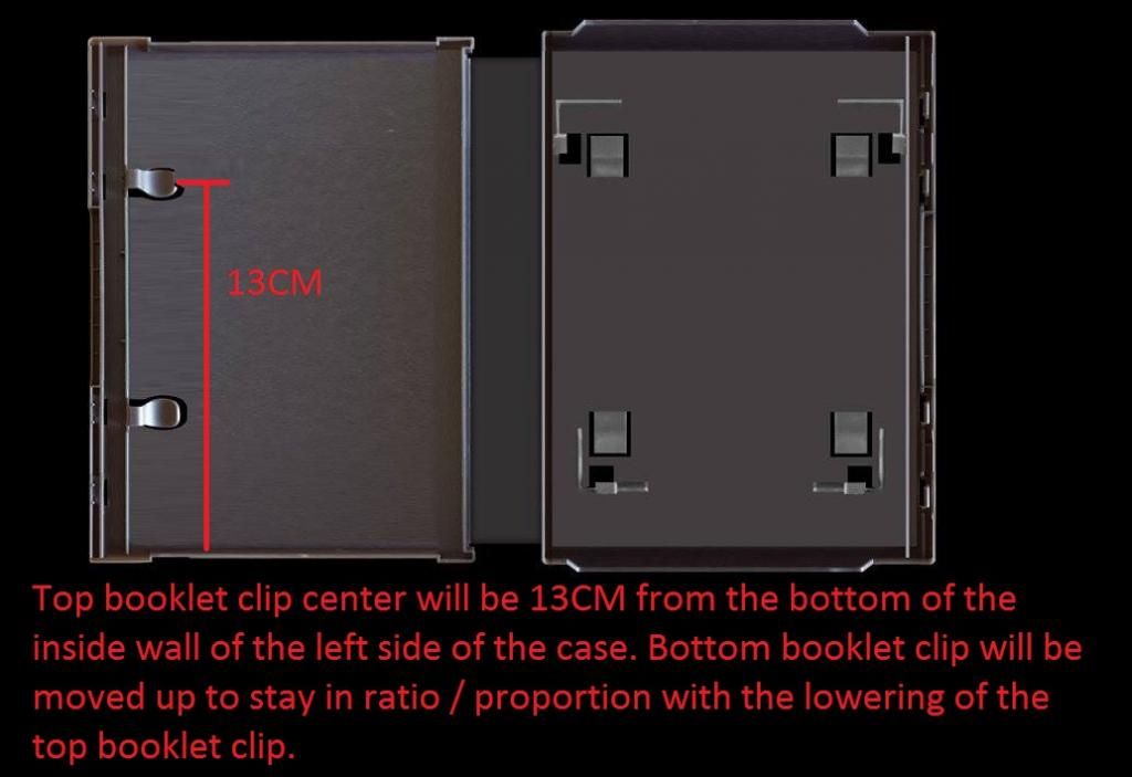 3.) The center of the top booklet clip on the left side of the cases needs to be 13MM from the