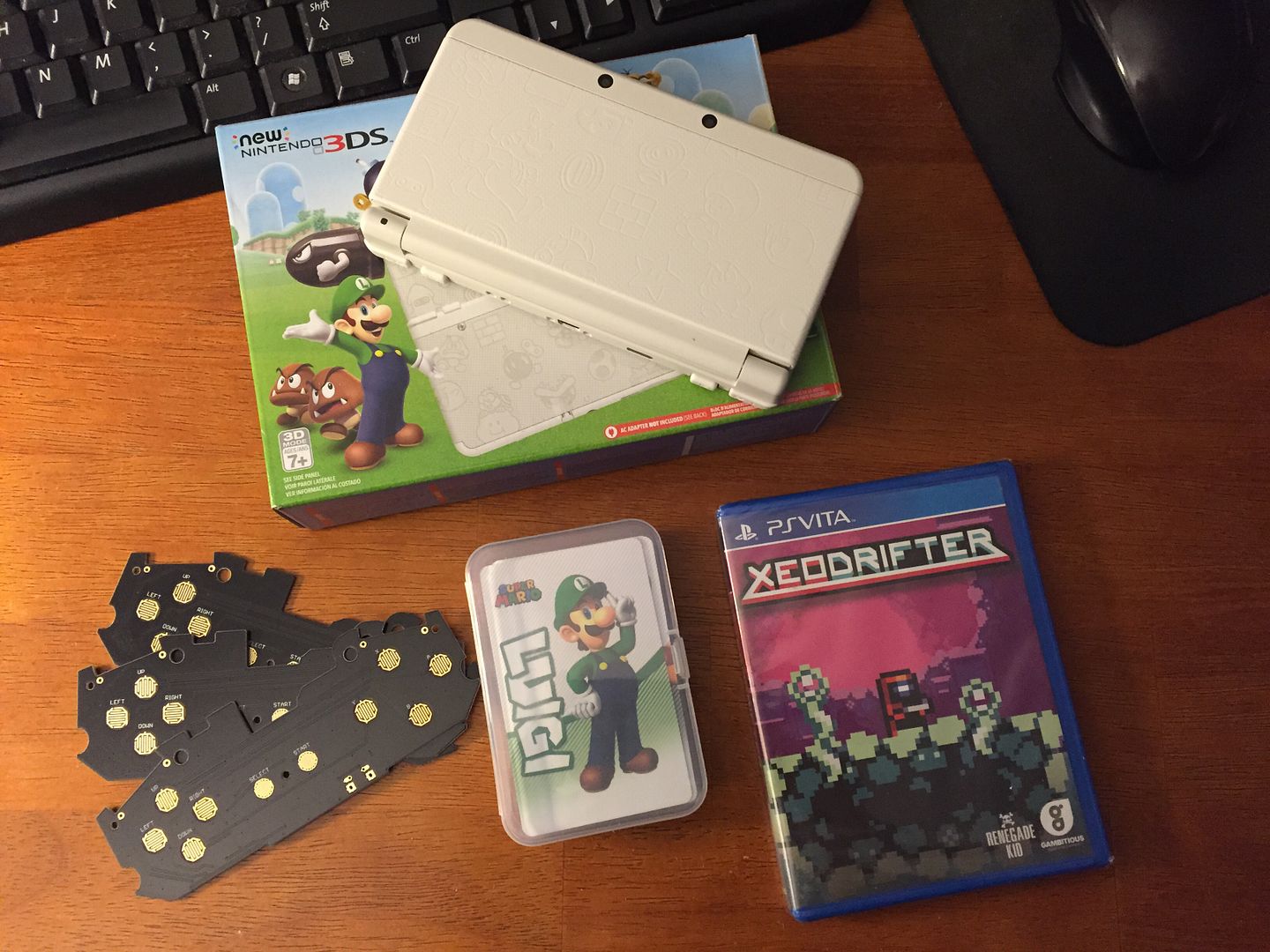 Goodies. Sold my Pokemon N3DS. Don't know why I even bought it. Got this white one and a Love+ DSi LL (still in transit). Only 1 DSi XL/LL to go!  The PCB boards are for a SNES controller. You can attach a Pi Zero directly to it to make a mini Pi console. I've got about 200 SFC controllers at the shop which were intended to be converted wireless, but that project was a total bust. Hopefully these boards will give me a reason to unearth those controllers.