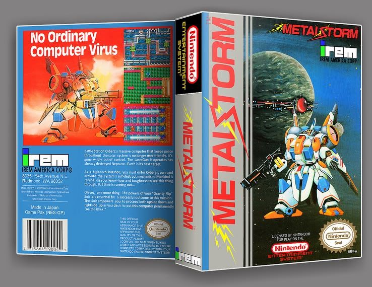 Do I sense a future review?  ;) Metal Storm is definetly a classic, I remember playing this alot myself when I had it when I was younger. The ability to effortlessly flip to the ceiling was a unique feature never seen anywhere els. Still need to pick this one up sometime. At least now when I do pick it up, we have a cover to go with it! ;D