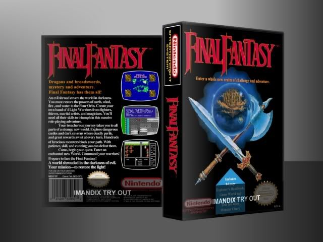 alright, here is final fantasy. retyped everthing because it just looks better that way. it used times new roman for the font, which is kind of odd for a cover, but whatever. i replaced the screenshots because the scans of the box didnt look too good. i tried to keep them as original as possible, and the first and last are pretty much the same, but the middle one is different. left off any kind of logo on the spine below the title because it said nintendo enough times already on the box. as always, let me know if there is anything that needs to be fixed. http://www.thecoverproject.net/uploads/Ragnarok2103.retail.nes_finalfantasy.jpg
