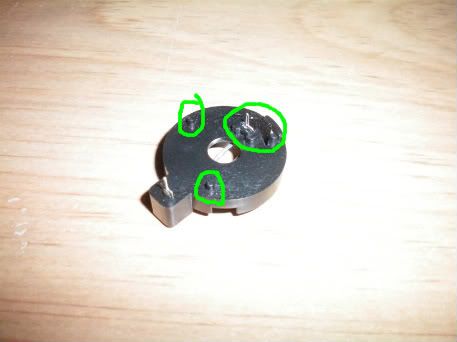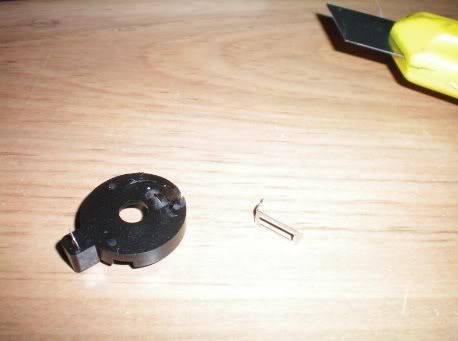 Then you going to take your exacto knife and make a small cut in the plastic right next to the existing hole by pushing down. Stick your small flathead screwdriver in the new hole you just cut and work it around a bit to open up the hole a bit more. As you can see in the picture I know have a new hole a little closer to the middle right next to the existing hole giving me enough room for my pins to line up perfectly.